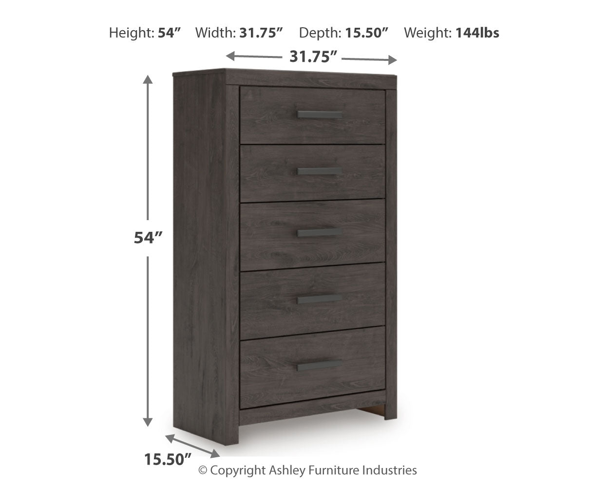 Designed with everyday style in mind, this chest of drawers is a simply chic approach to modern living. A dark charcoal finish blends black and brown undertones, creating a versatile look that effortlessly pairs with your existing pieces. And for must-have function, five smooth-gliding drawers store clothes and linens in charming fashion.