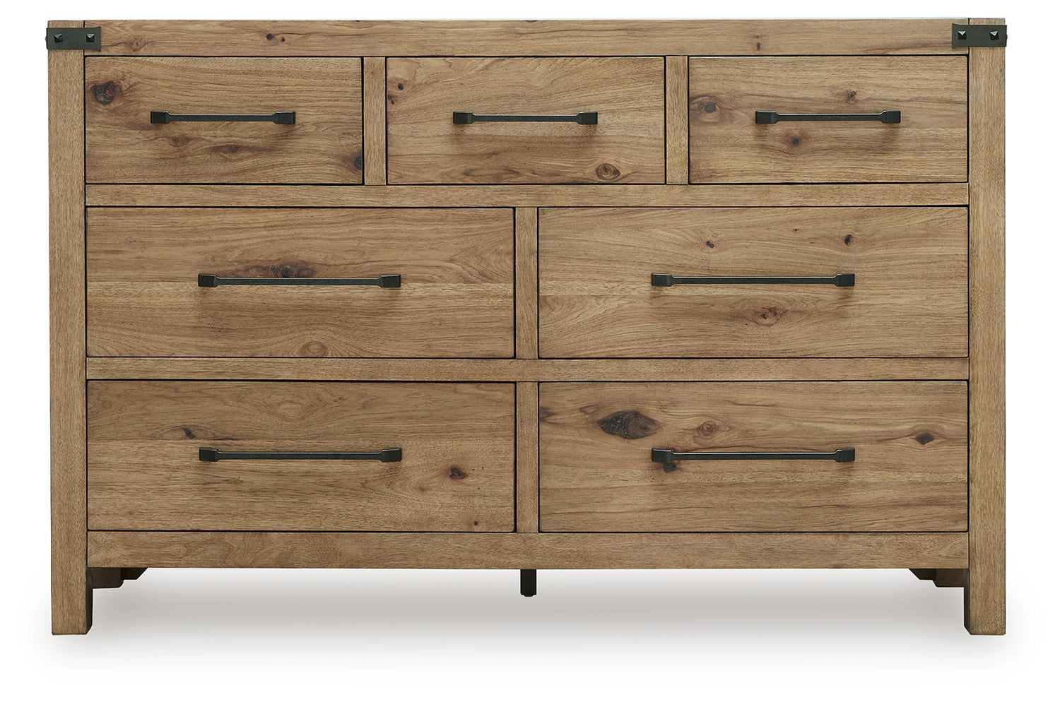Rustic character with a dash of refinement. Outfitted with stunning hickory veneer and completed with a natural finish, this queen panel bed celebrates the authentic beauty of wood. Its sturdy silhouette and large framed panels lend a luxurious weight and dimensionality to the look. Metal accents introduce an industrial-inspired flair.