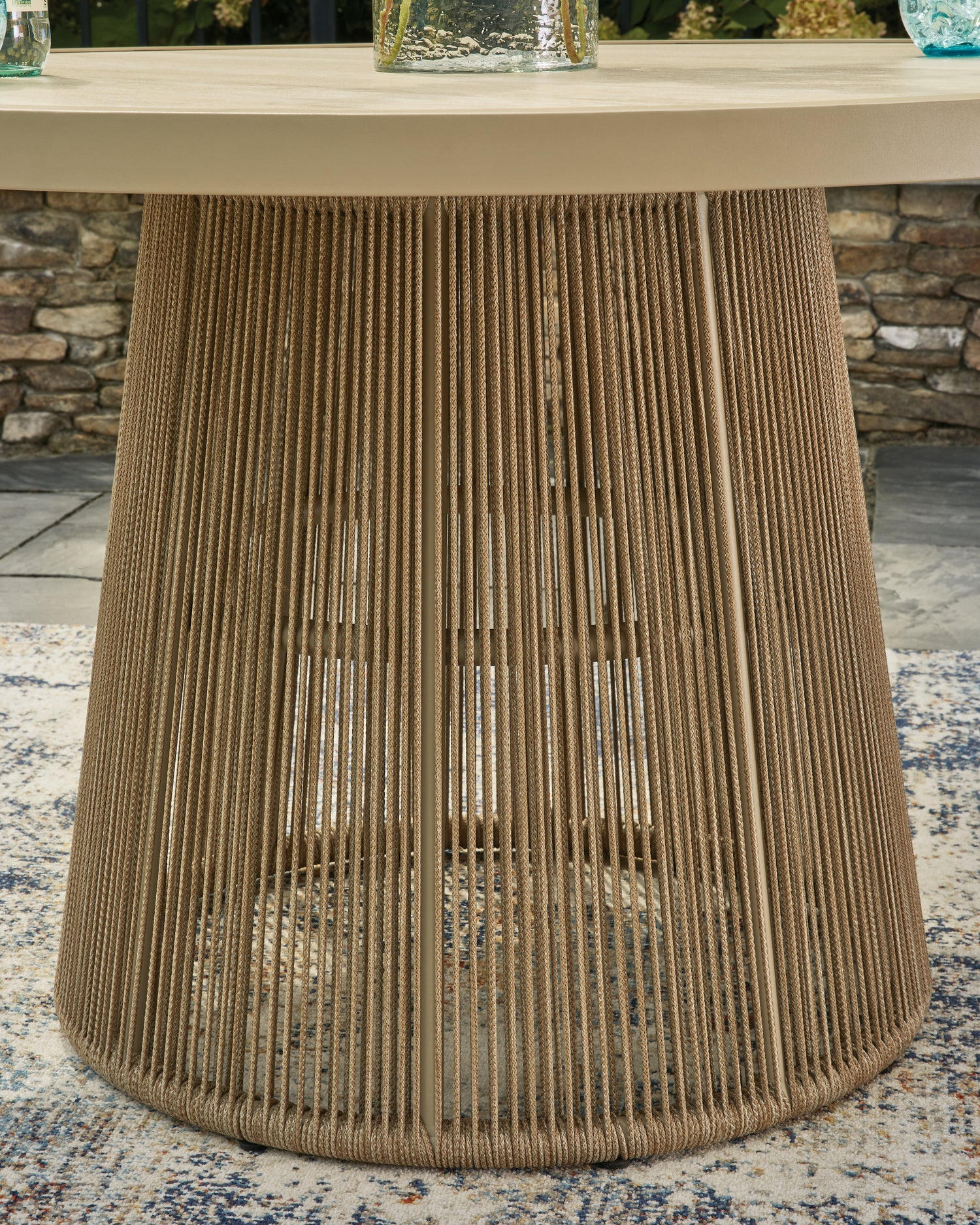 Whether it's decking out your deck or making a splash by the pool, this outdoor dining table is all about easy-breezy outdoor living. Its base features a nicely neutral rope wrap over a sturdy, rust-resistant aluminum frame that’s sure to weather the seasons beautifully. A sintered stone top enhances the table’s beauty and robustness.