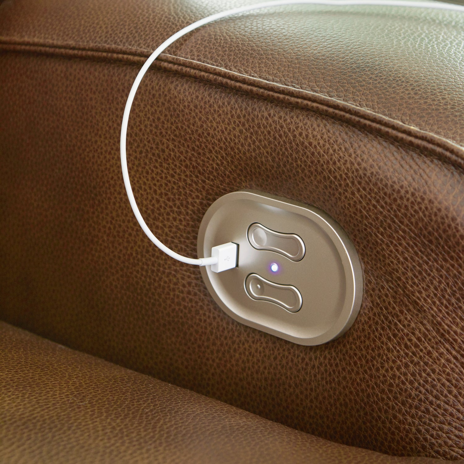 Master statement-making contemporary comfort with this power reclining sofa. It displays a striking yet streamlined profile, with expertly matched leather and faux leather upholstery in an auburn hue balancing natural beauty and refined design. Adjustable headrests and USB charging polish off this richly crafted piece.