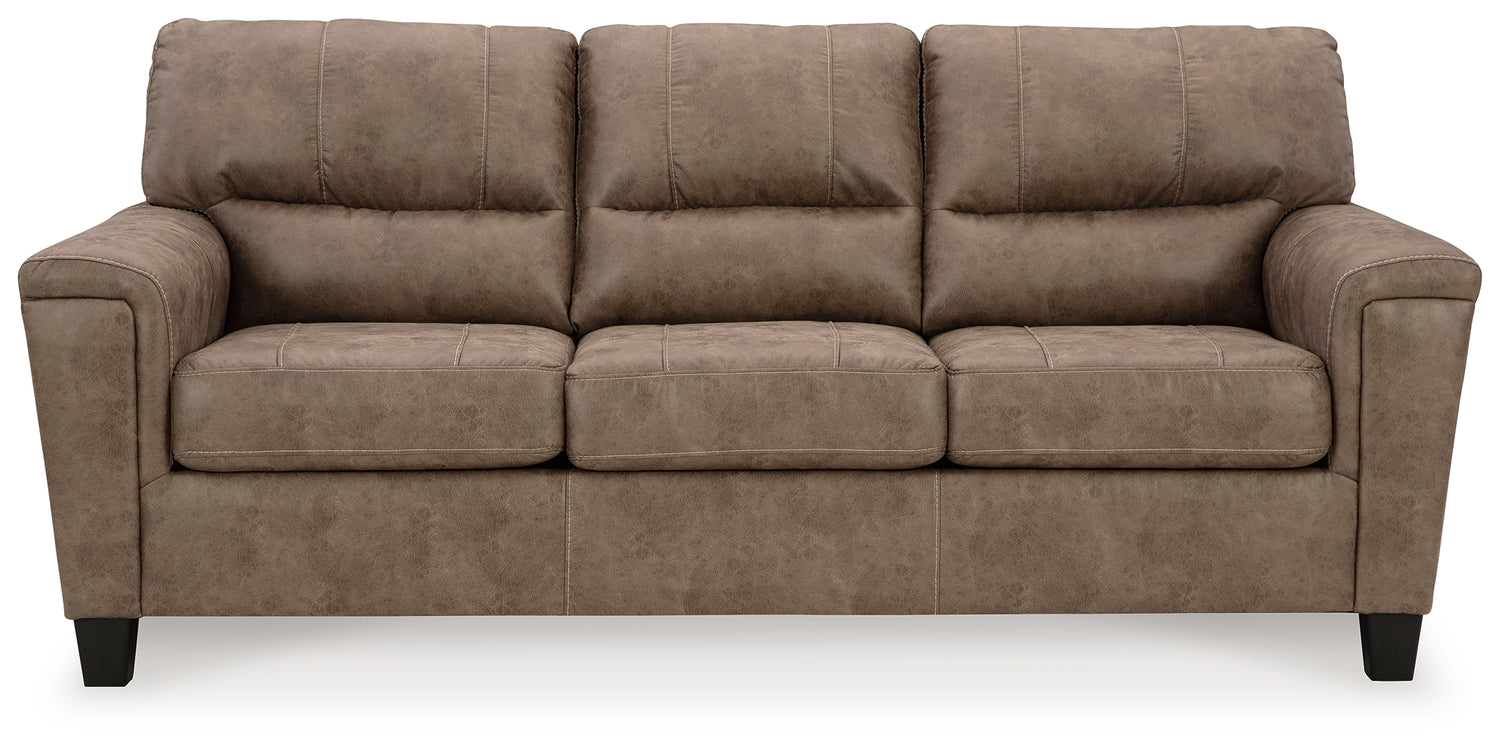 If you love the cool look of leather but long for the warm feel of fabric, you can take comfort in this loveseat. Wrapped in a fabulous faux leather with a weathered hue and hint of pebbly texture to resemble the real deal, this decidedly modern loveseat proves less is more. Elements include angled side profiling and track armrests wrapped with a layer of pillowy softness for that little something extra. Prominent jumbo stitching and clean-lined divided back styling lend fashion-forward flair.